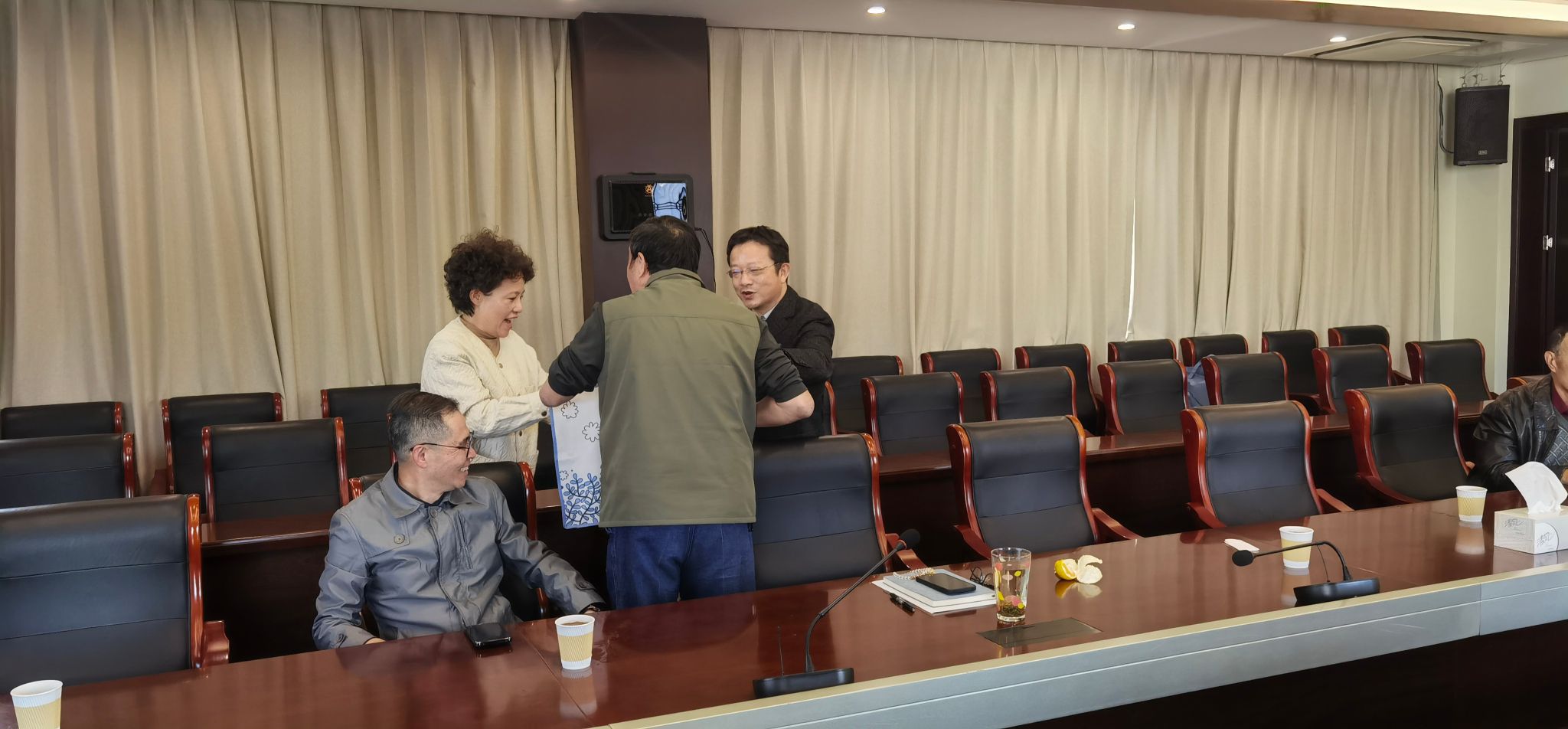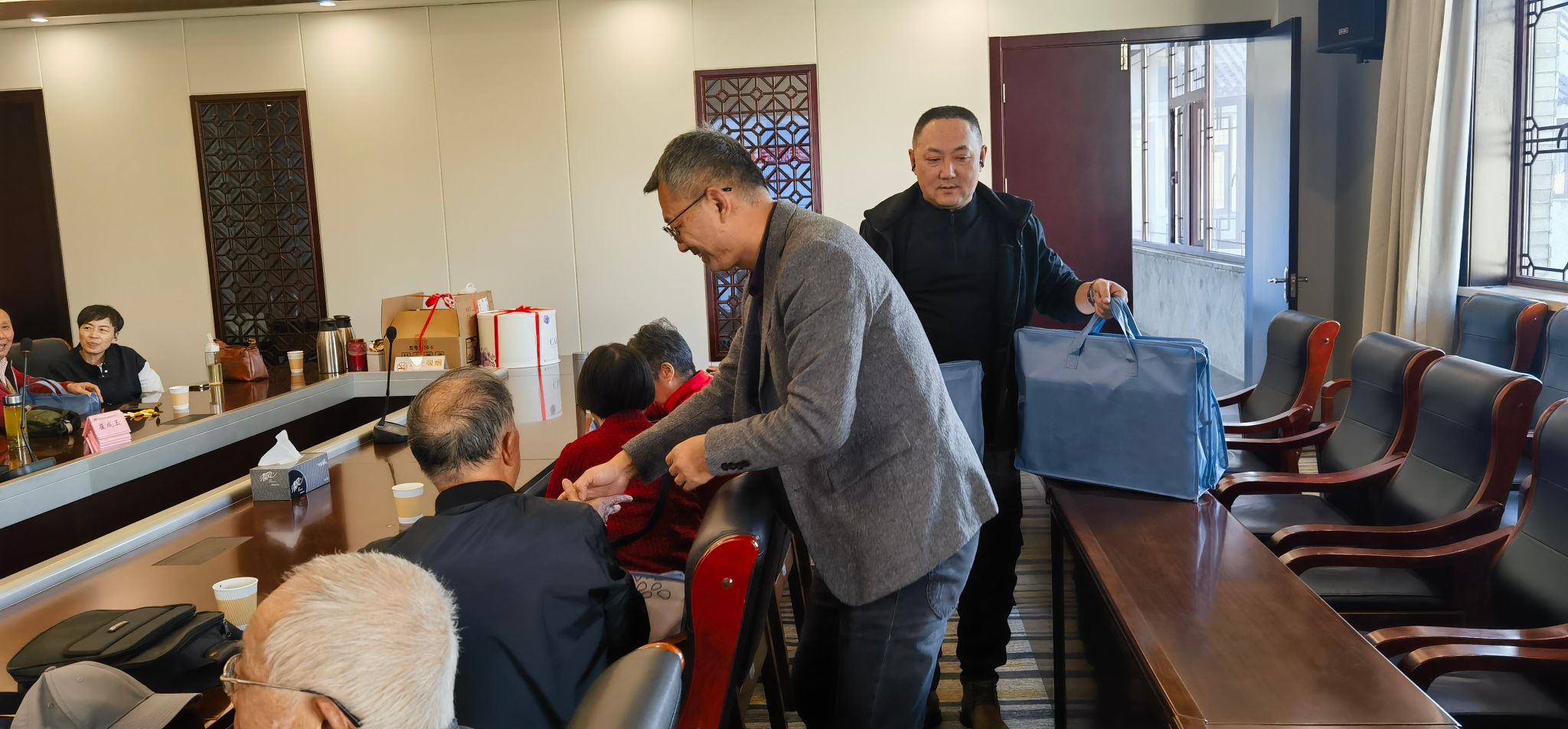 最后,学校领导还向各位老寿星们赠送了精心准备的重阳节慰问品,表达全体师生的一片心意。校领导和老寿星们一起品尝蛋糕、合影留念,为老同志们送上了诚挚的祝福,会议室里洋溢着节日的温馨气氛,祝寿活动在一片欢声笑语中圆满落下帷幕。