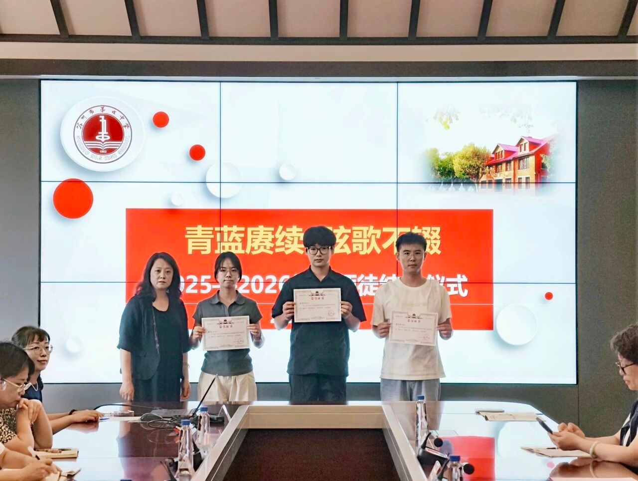 之后,曹敏华书记宣读了2025-2026学年师徒结对的决定,由朱翔副校长和陈燕青副校长为学科指导老师和班主任指导老师颁发聘书。