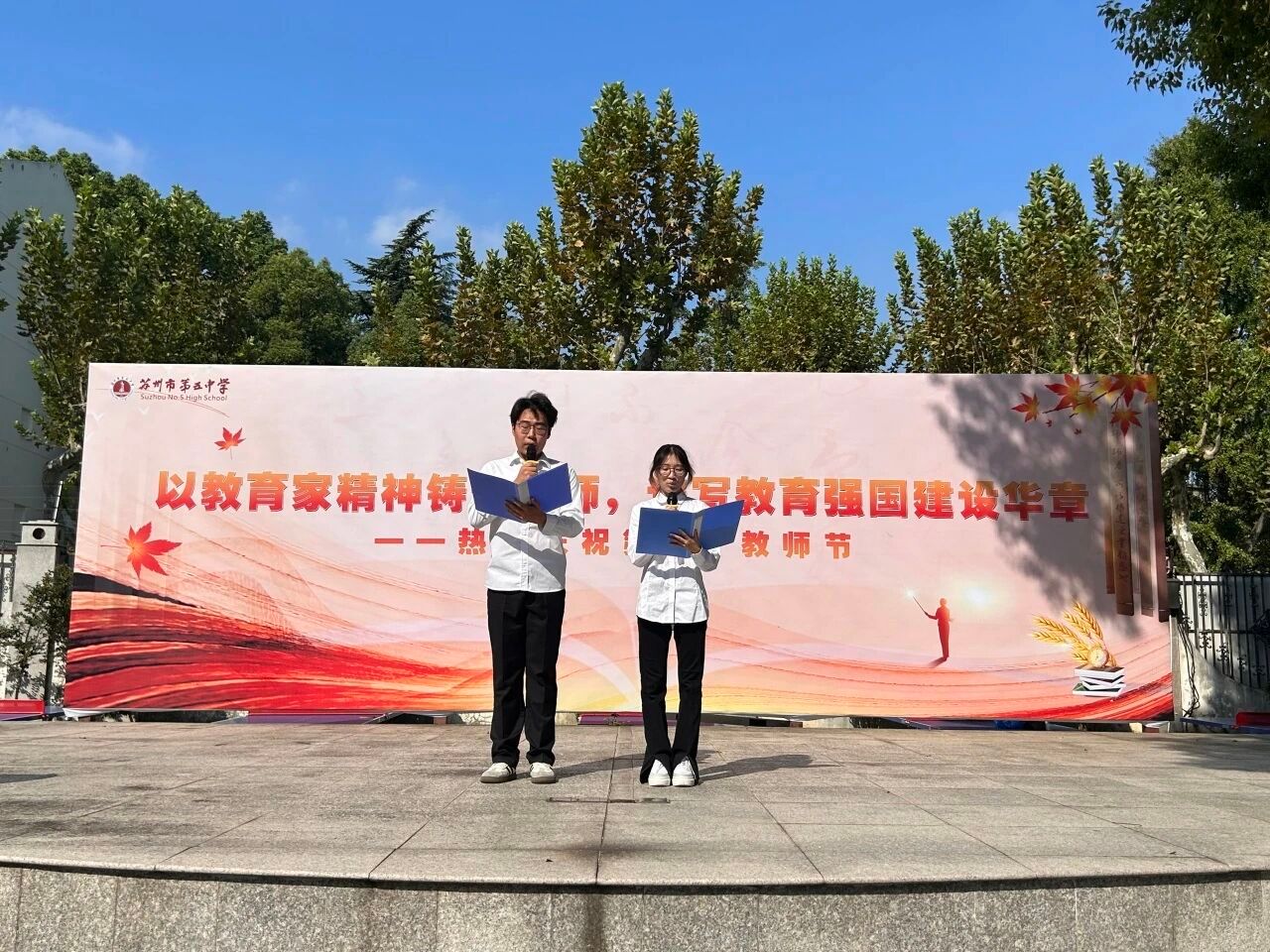 高三1班王熙奥、高三5班王春阳代表全校学生以诗寄情,悠扬诗声伴微风回荡校园,尊师感恩的暖流在晨光中静静流淌。