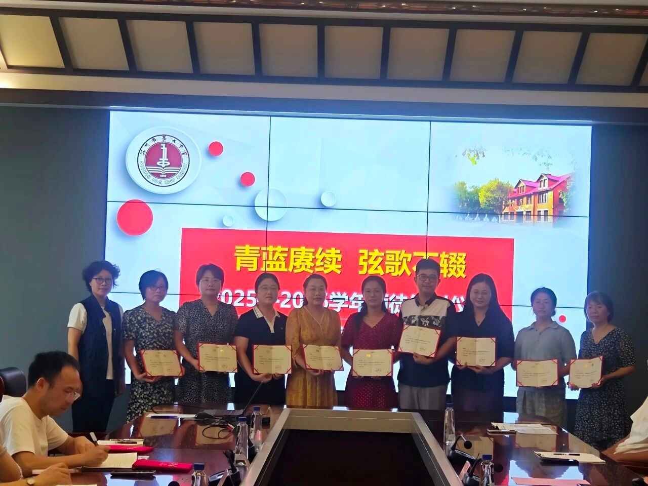 会上,曹敏华书记为在2024-2025学年青年教师考核中获得“教坛新苗”“德育之星”“教科研之星”的杜思远、路仪轩和崔成玉三位老师颁奖。