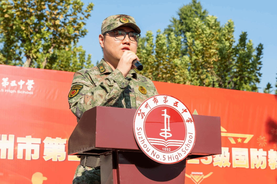 金阊街道人民武装部杨奕部长发言。杨部长表示军训是意志磨炼与成长蜕变的过程,能全面塑造精神、纪律、责任与团队意识。全体教官承诺会以军人标准严格要求自己,确保训练安全有序高效。同时,他也向同学们提出严守纪律、团结协作、刻苦训练的要求,希望大家在军训中锤炼意志、学会责任担当、收获成长自信。