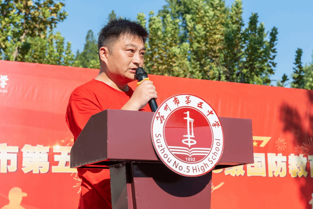 柯勤校长宣布军训开营仪式“开始”后, 学生处陈成副主任主持开营仪式。陈副主任要求同学们在军训中听指挥、肯坚持、懂协作,把五中“诚仁勤朴”的校训融入每一次训练中去,用汗水浇灌意志,用行动证明自己。