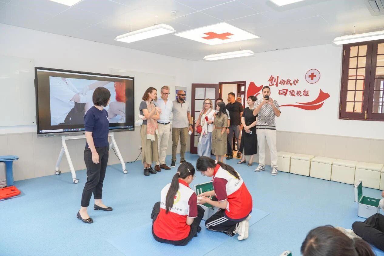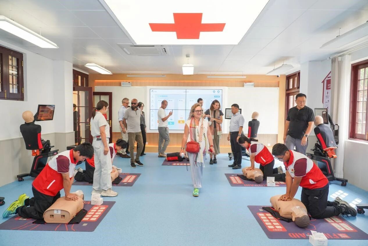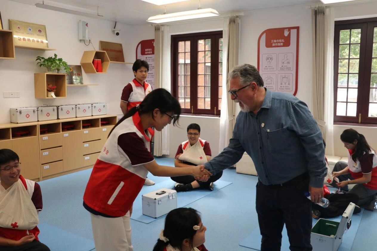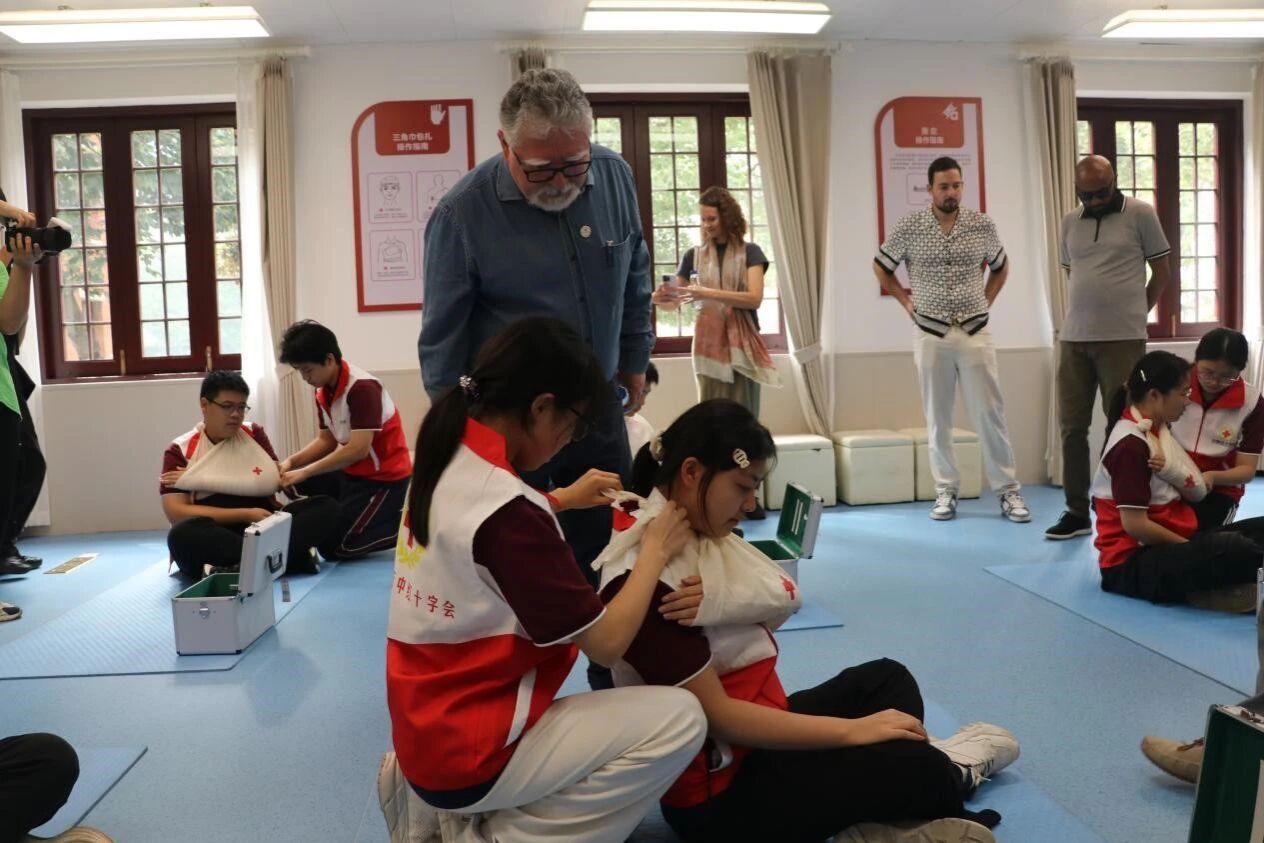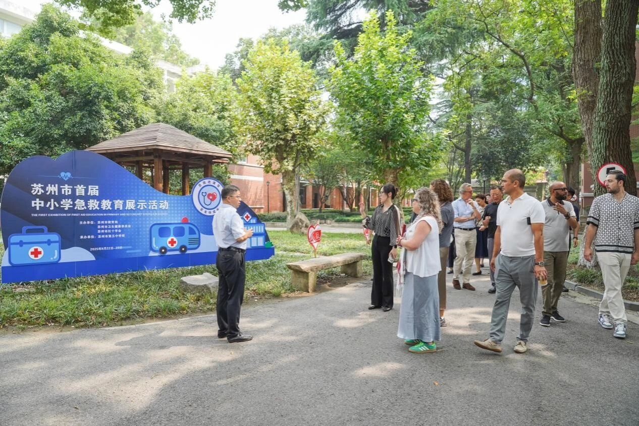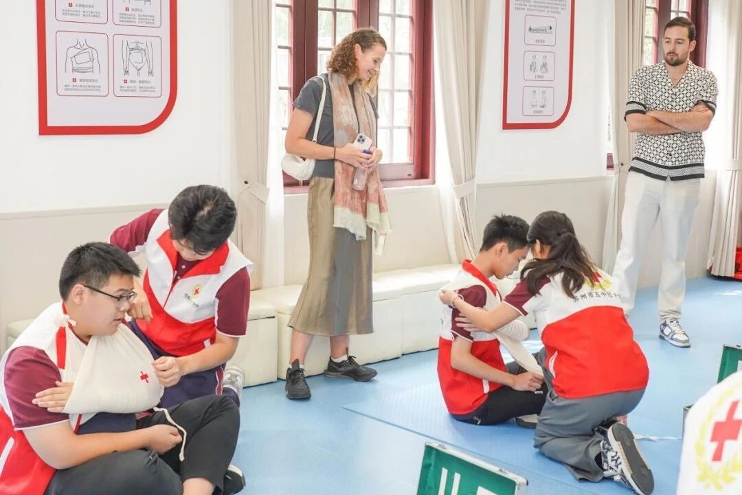 2025年9月7日,一场跨越山海的温暖相遇,在苏州市第五中学的百年校园中悄然开启。来自智利、英国、吉尔吉斯斯坦、埃塞俄比亚、格鲁吉亚等国家红十字会及牛津大学的专家、学者在中国红十字总会联络部宋毅副部长、省红十字会钟萍副会长等领导的陪同下,齐聚五中,共同见证中国学校急救教育蓬勃发展的成果。