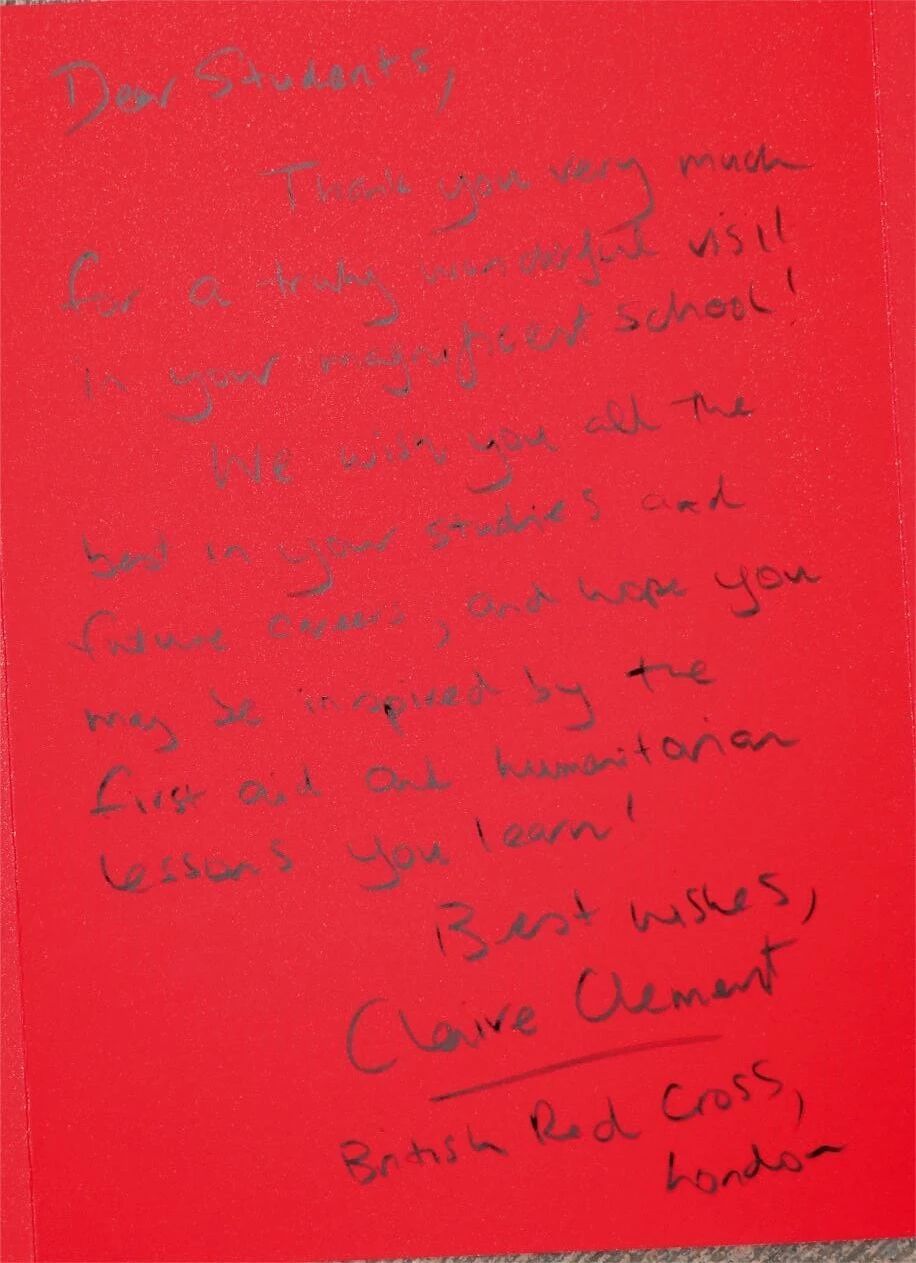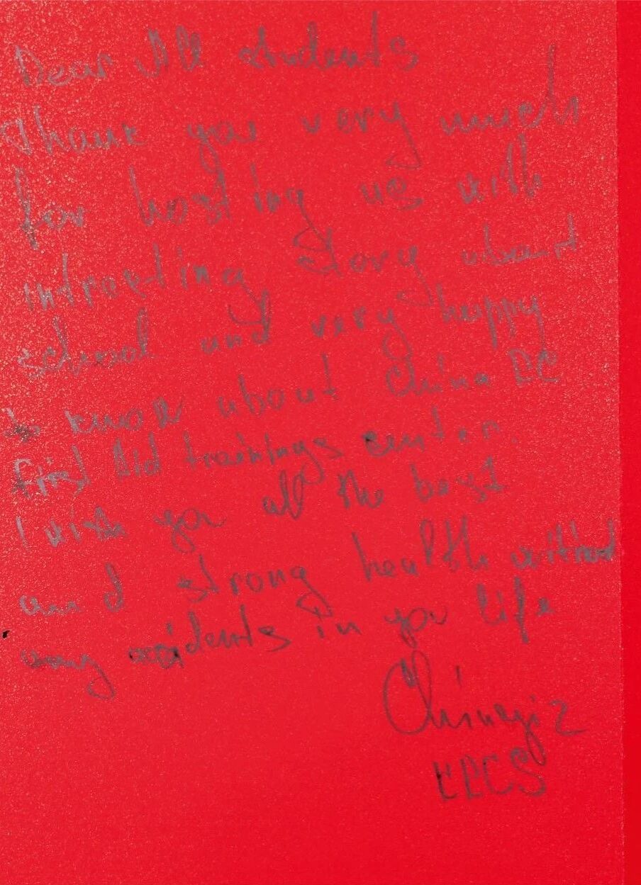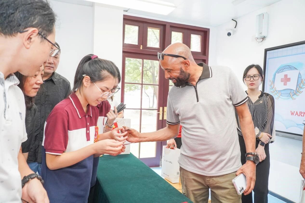 理论教室内,温馨的氛围弥漫其间。学生代表向外宾赠送了精心准备的校史纪念品,每一份礼物都承载着五中师生的深厚情谊。外宾们不仅在贵宾簿上留下了真挚的祝福,还与学生们亲切合影。一位英国红会代表勉励学子:“今天掌握的急救技能,不仅能保护身边的人,更能让你们成为未来红十字事业的中坚力量。”