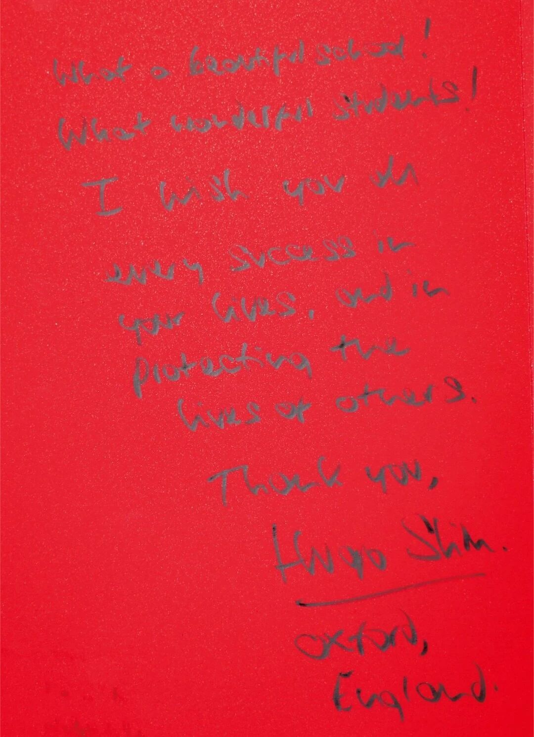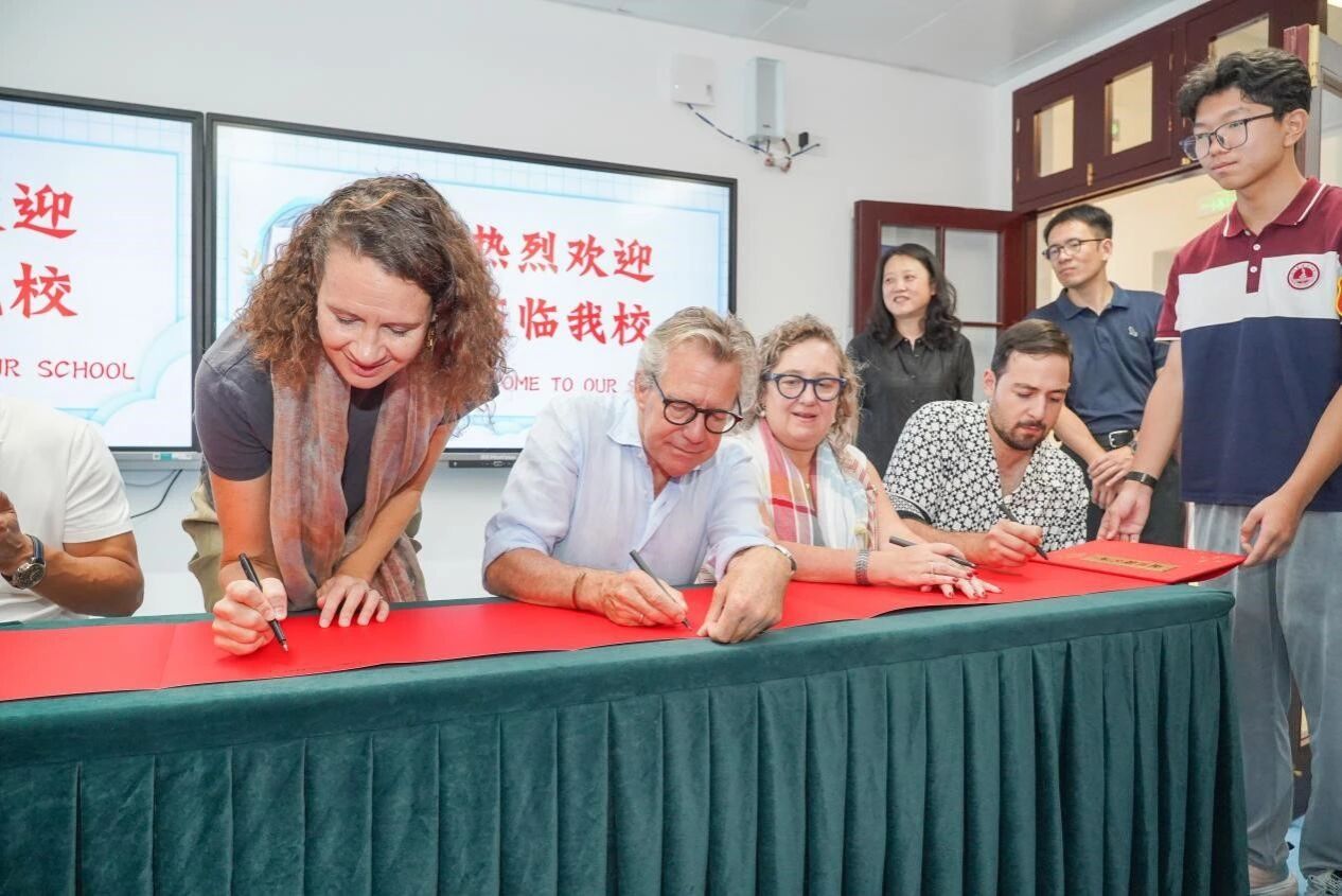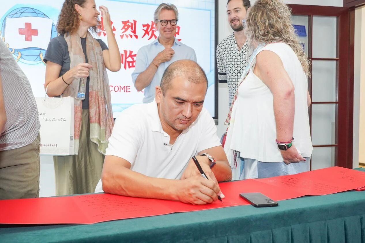 理论教室内,温馨的氛围弥漫其间。学生代表向外宾赠送了精心准备的校史纪念品,每一份礼物都承载着五中师生的深厚情谊。外宾们不仅在贵宾簿上留下了真挚的祝福,还与学生们亲切合影。一位英国红会代表勉励学子:“今天掌握的急救技能,不仅能保护身边的人,更能让你们成为未来红十字事业的中坚力量。”